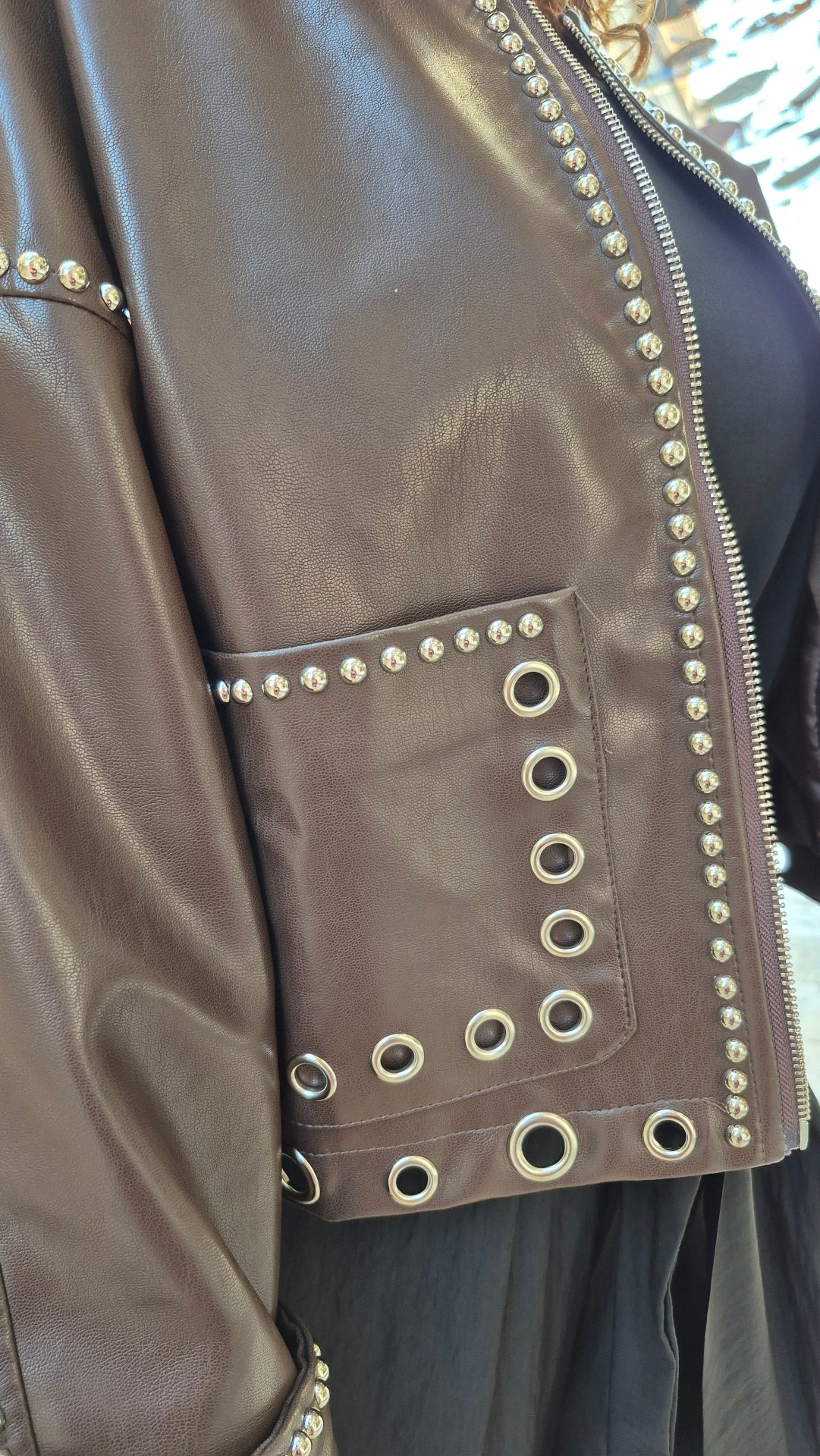Cazadora de mujer tipo biker en color marrón chocolate. Lleva tachuelas y perforaciones en color plateado.