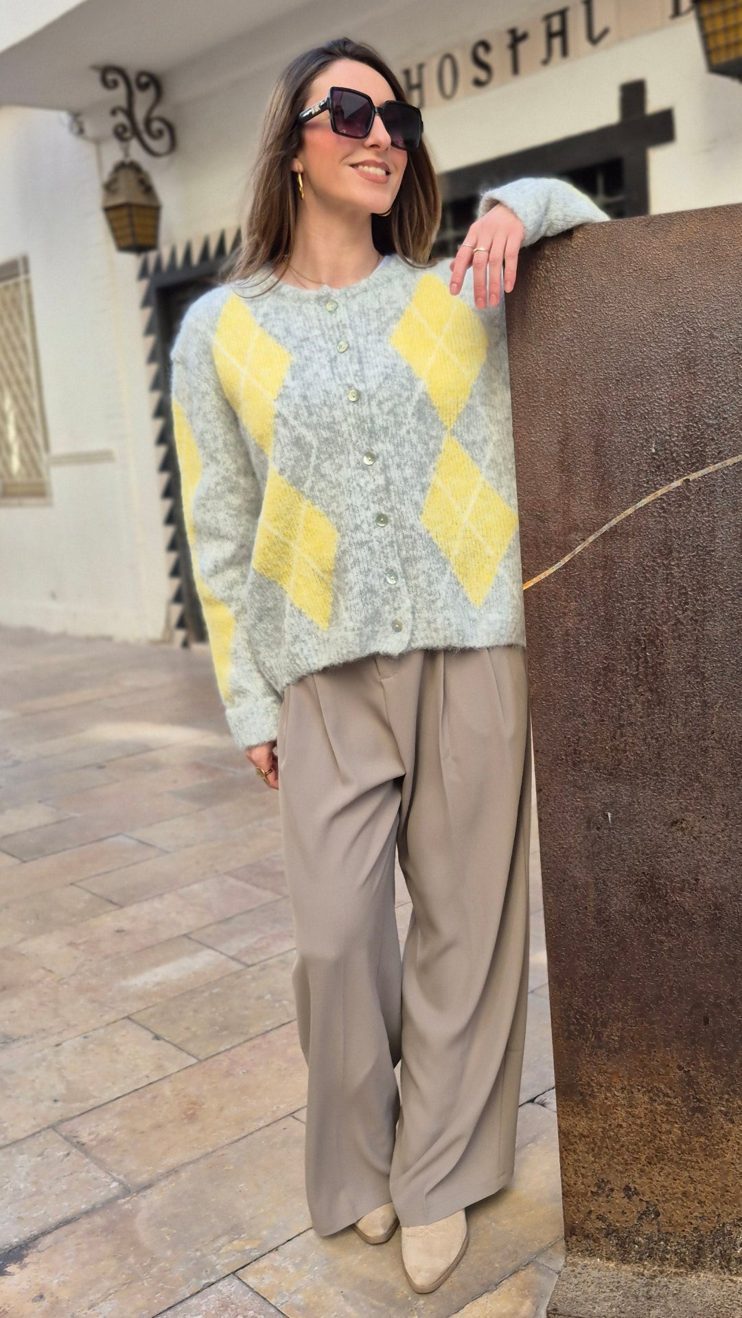 Chaqueta de mujer en color gris con rombos en amarillo.