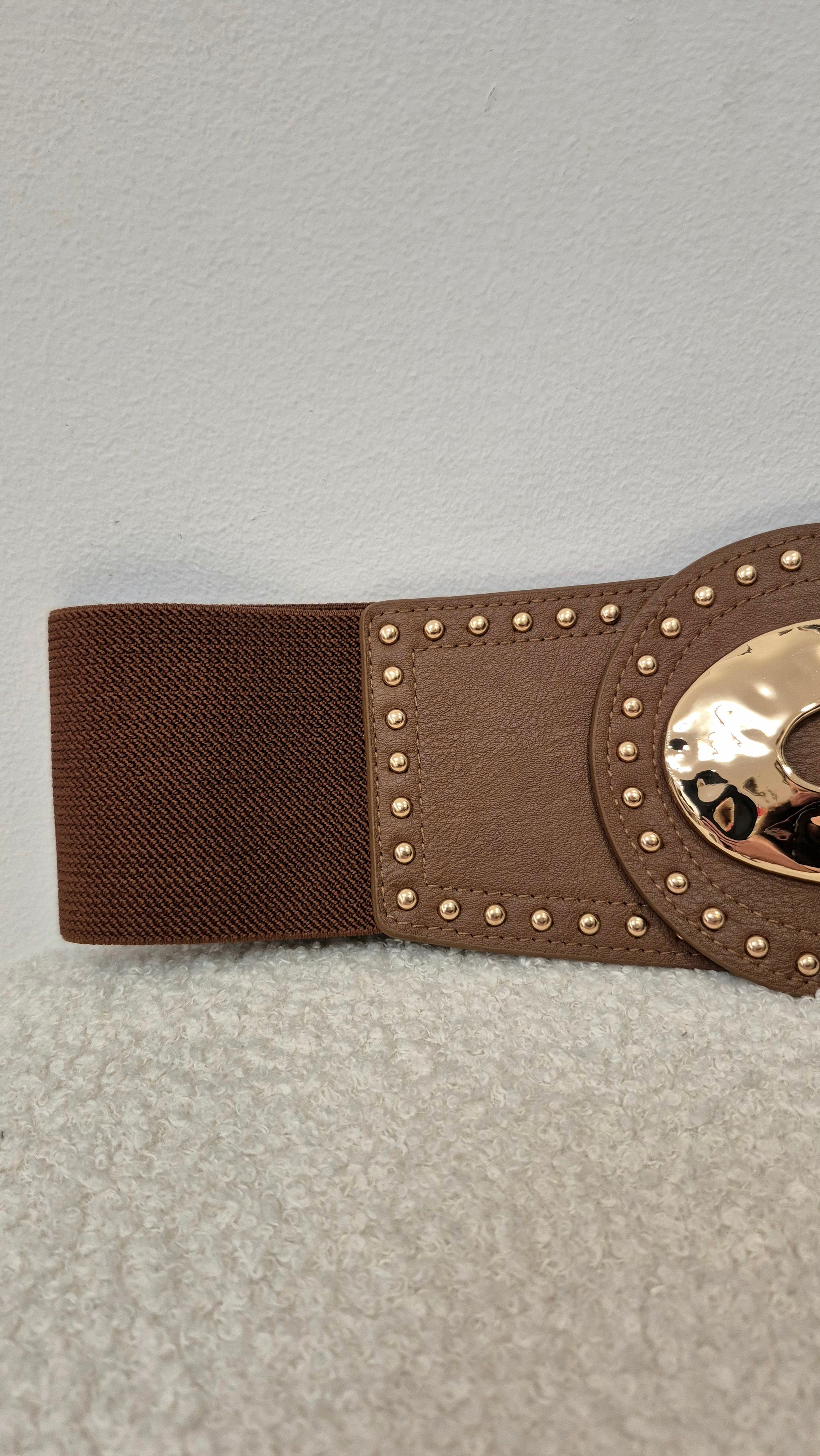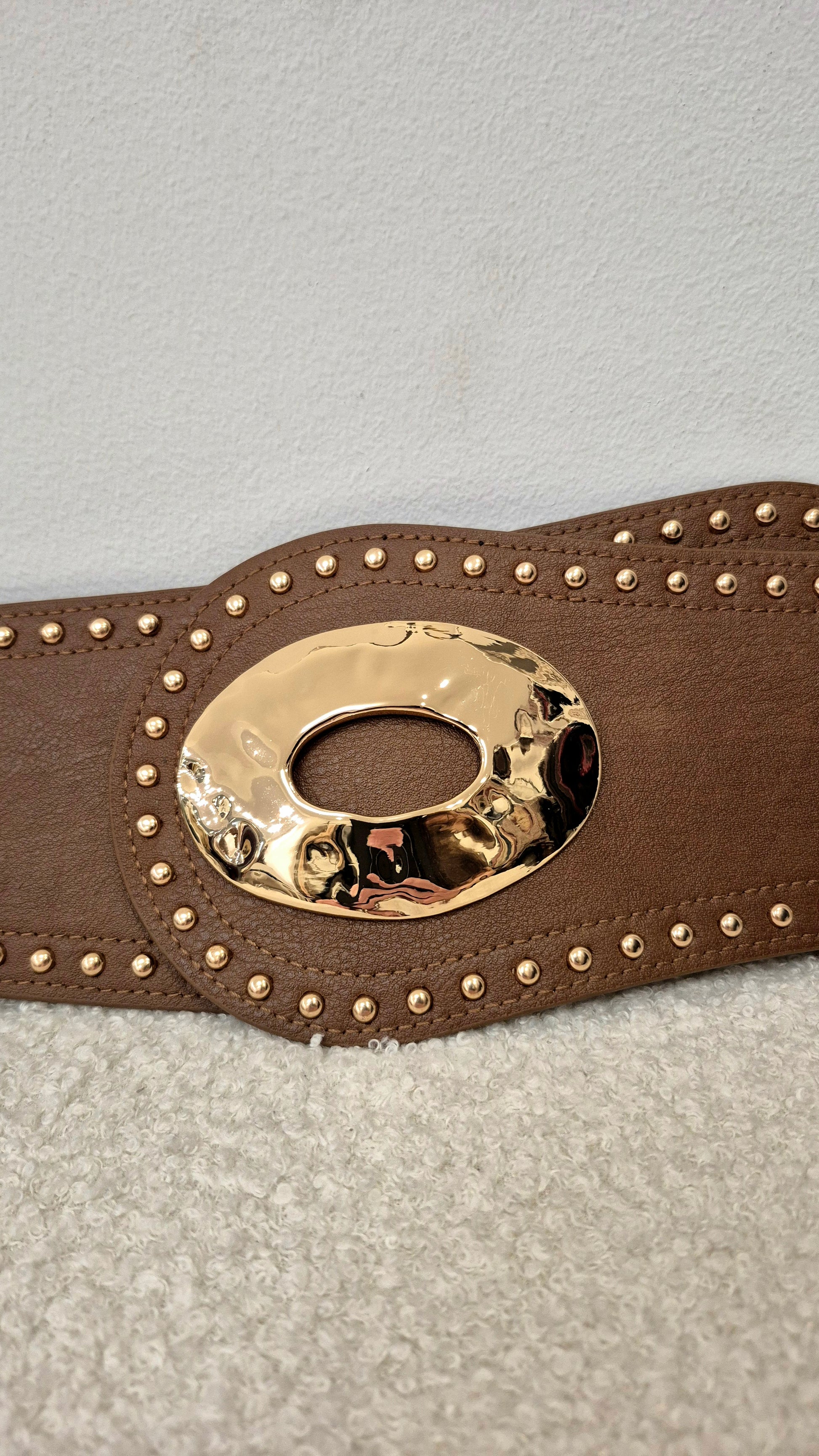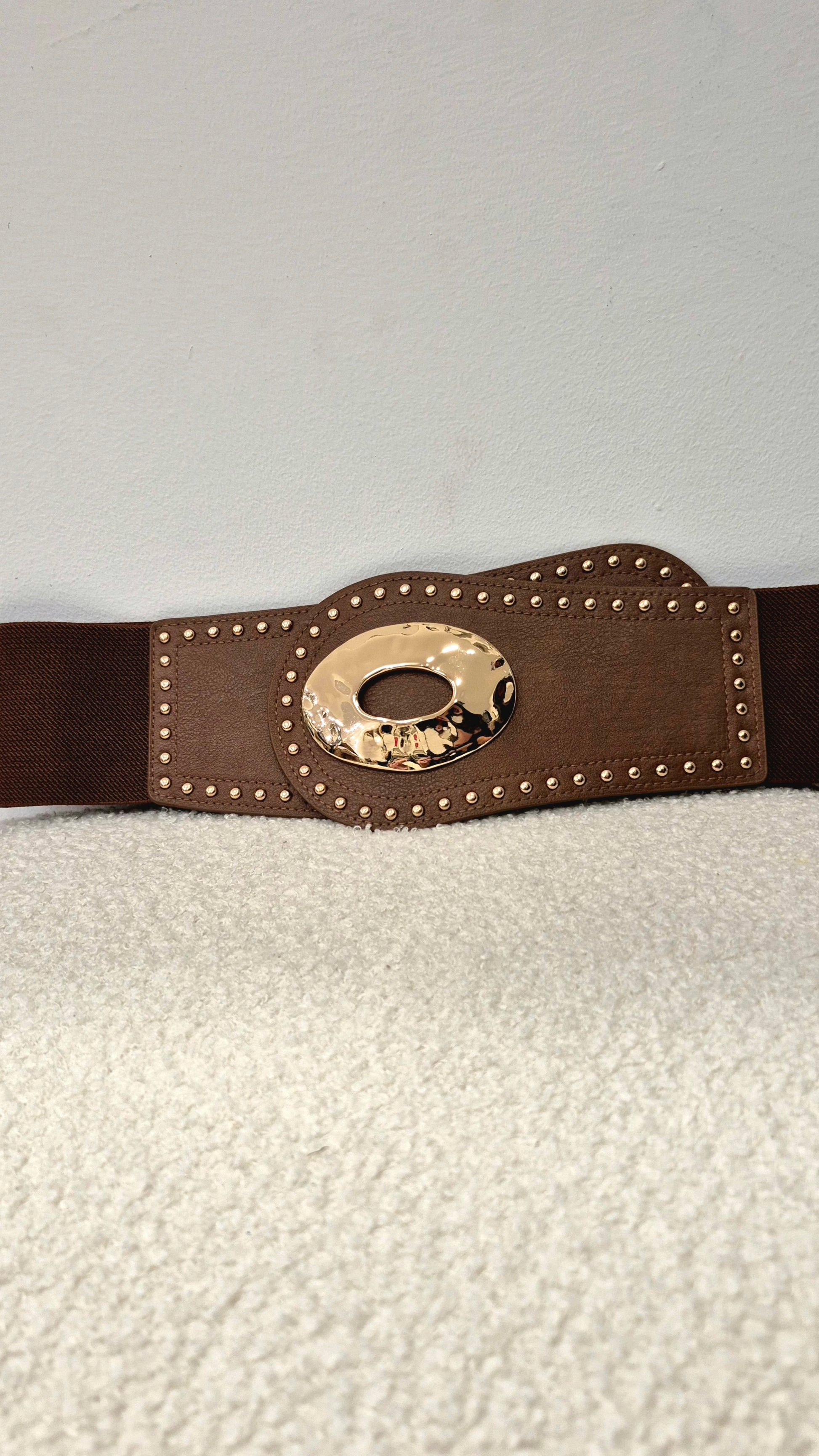 Cinturón ancho de mujer, tipo fajín con hebilla en color dorado en la parte delantera. Con goma en la parte trasera para que se adapte mejor al cuerpo.