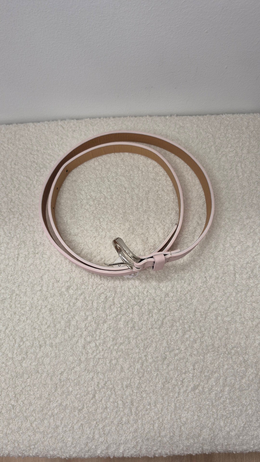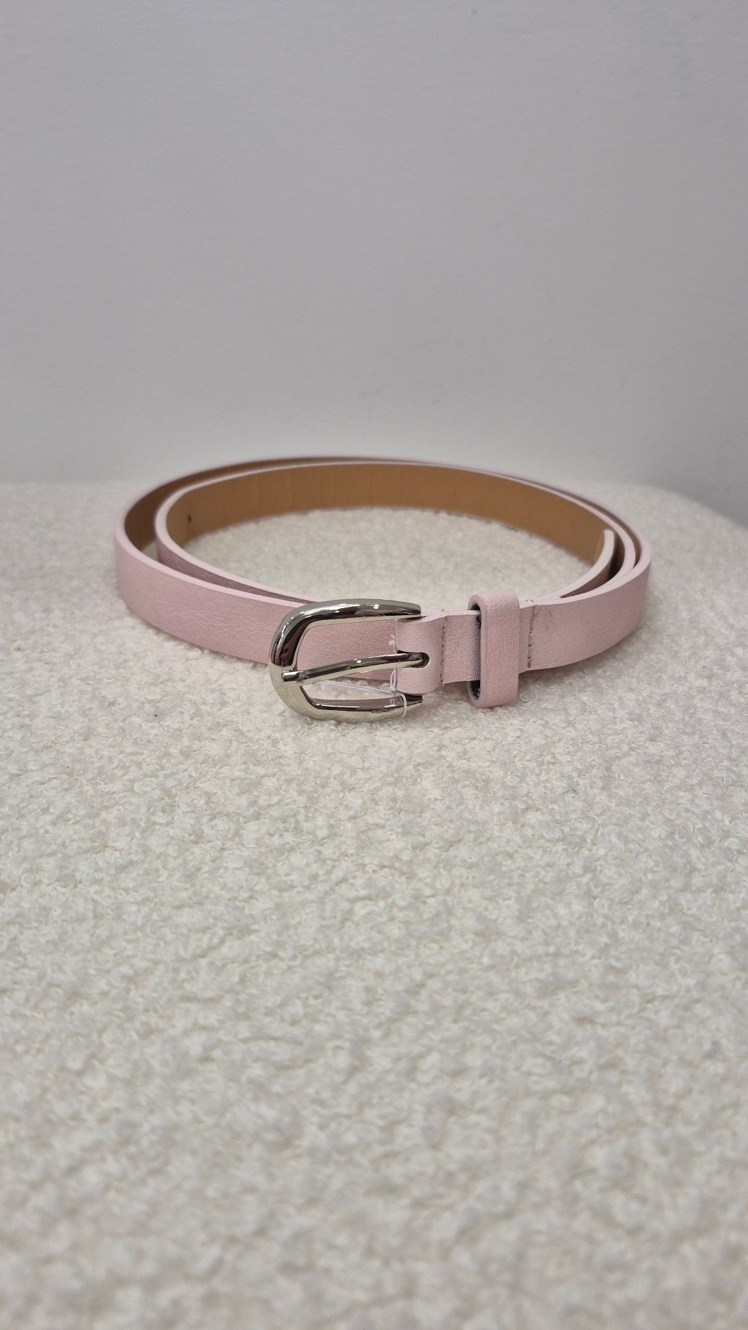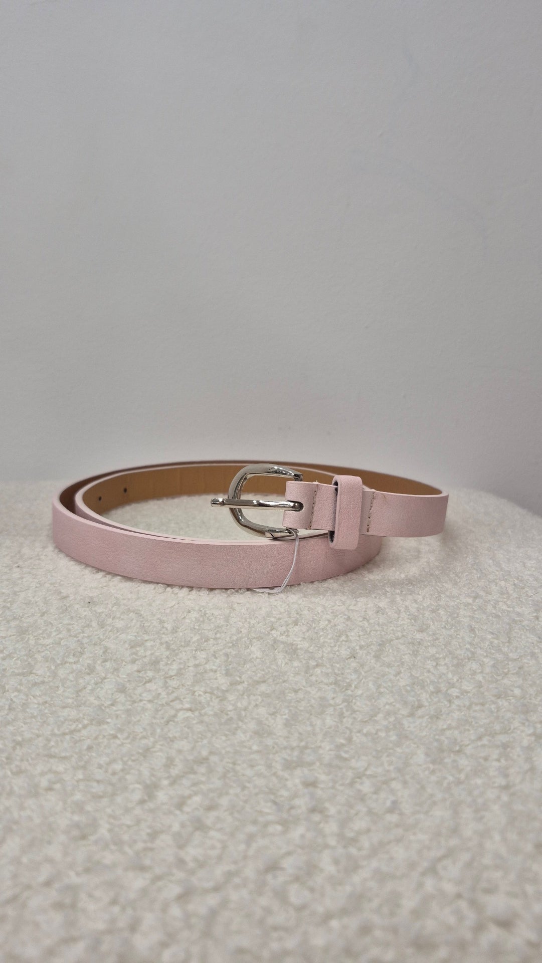 Cinturón fino en color rosa palo con hebilla en plateado.