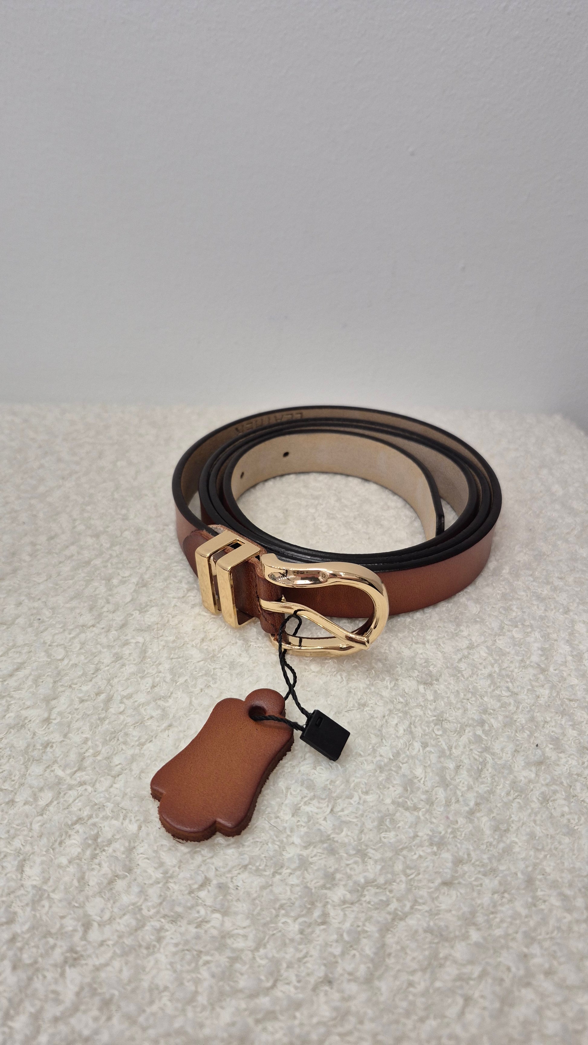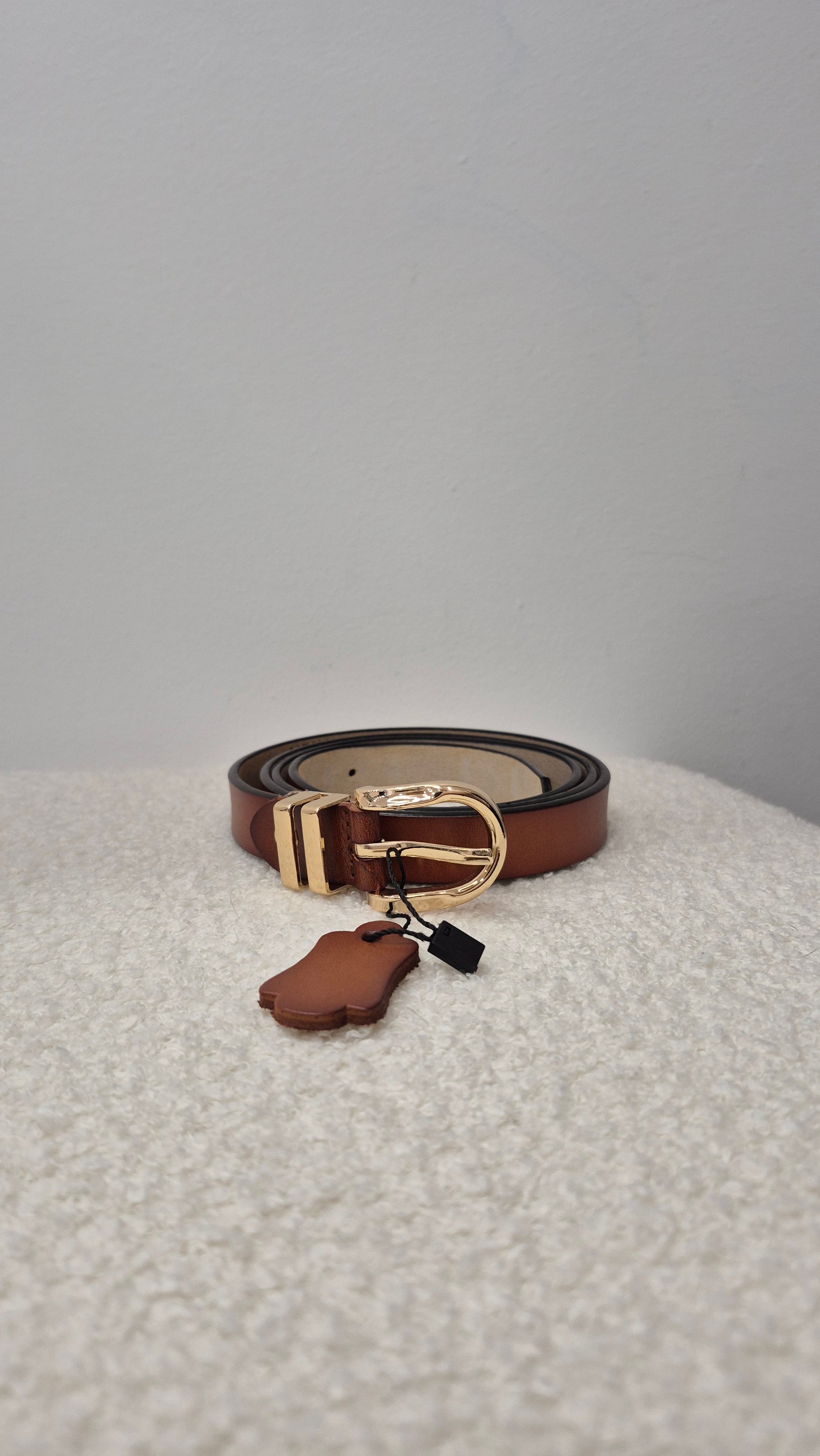 Cinturón marrón con hebilla en color dorado.