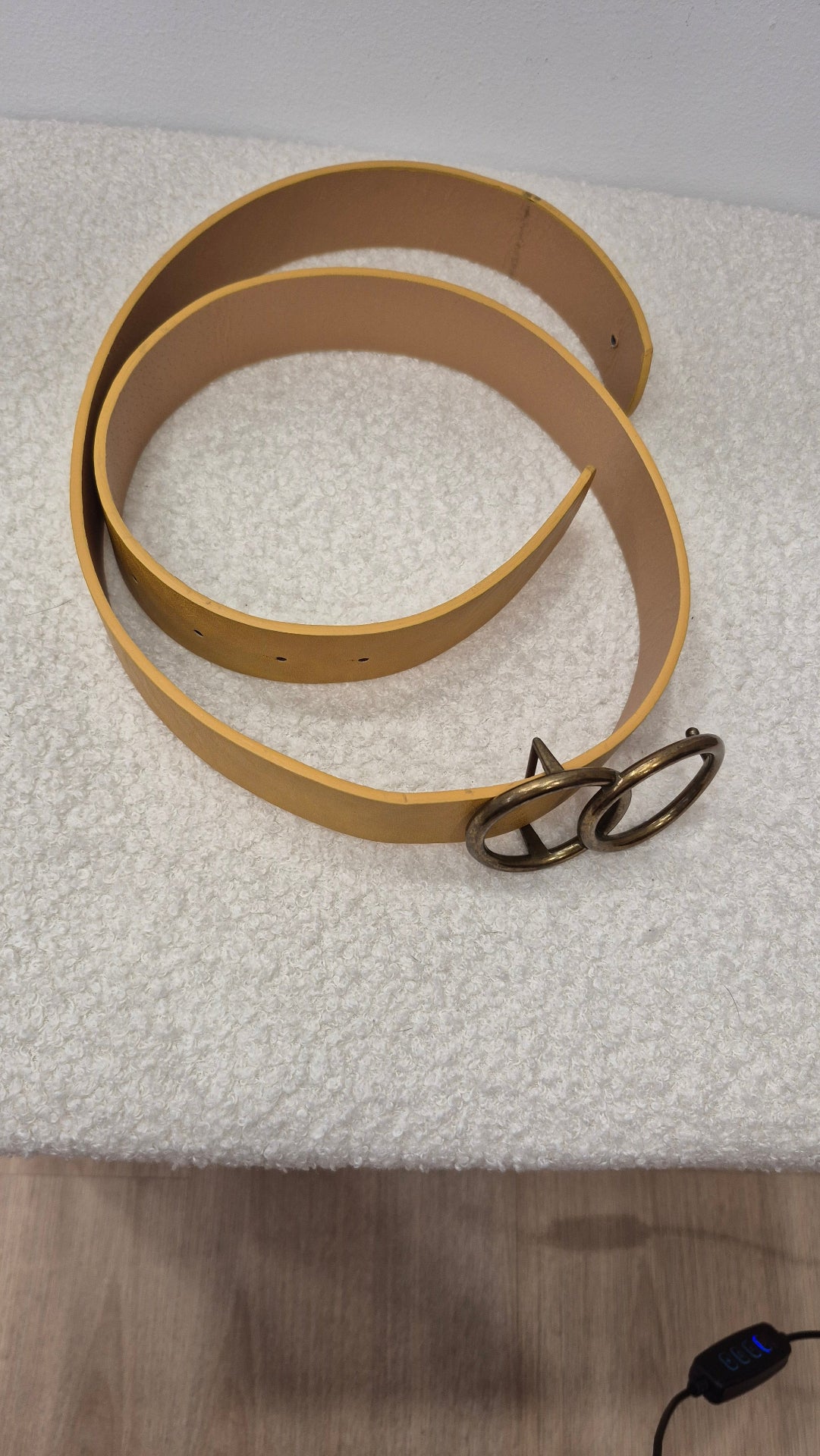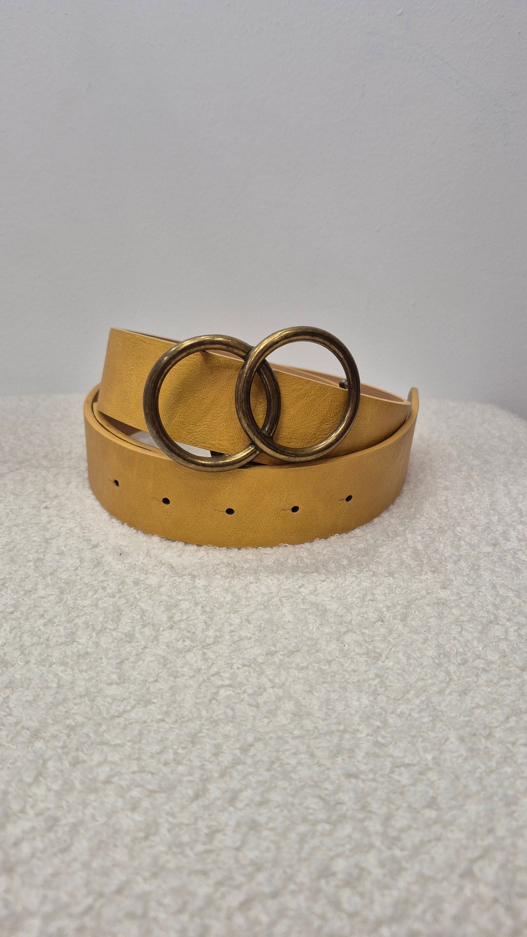 Cinturón en color mostaza, con hebilla con 2 círculos en color dorado.