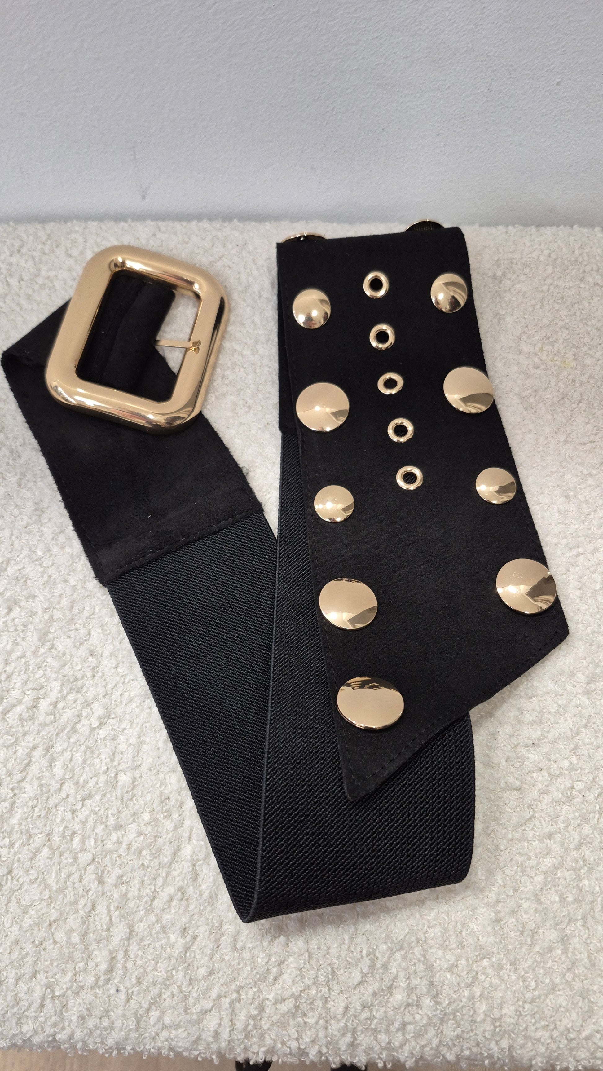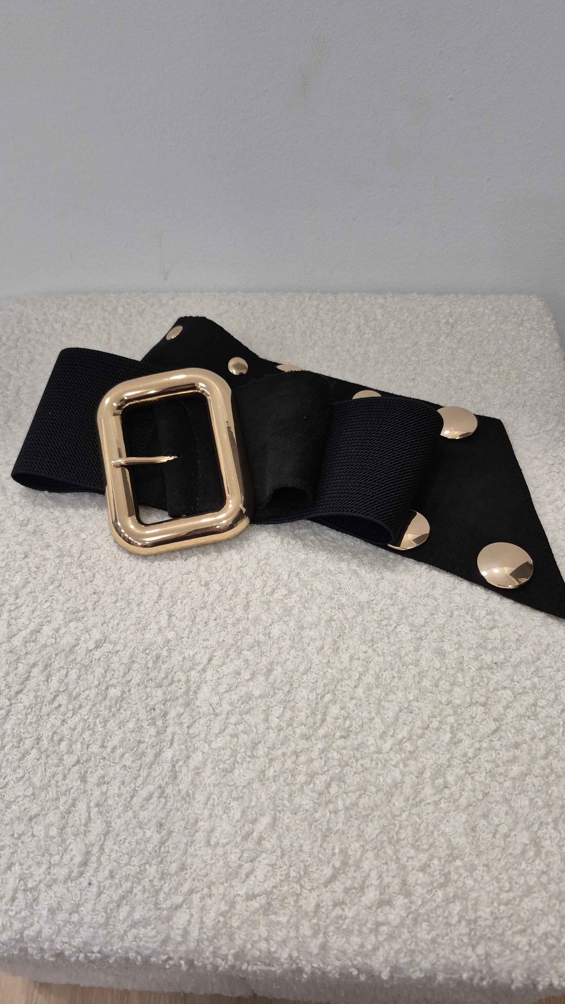 Cinturón negro de mujer, con tachas en color dorado. Con goma elástica por la parte trasera, para que se adapte mejor al cuerpo.