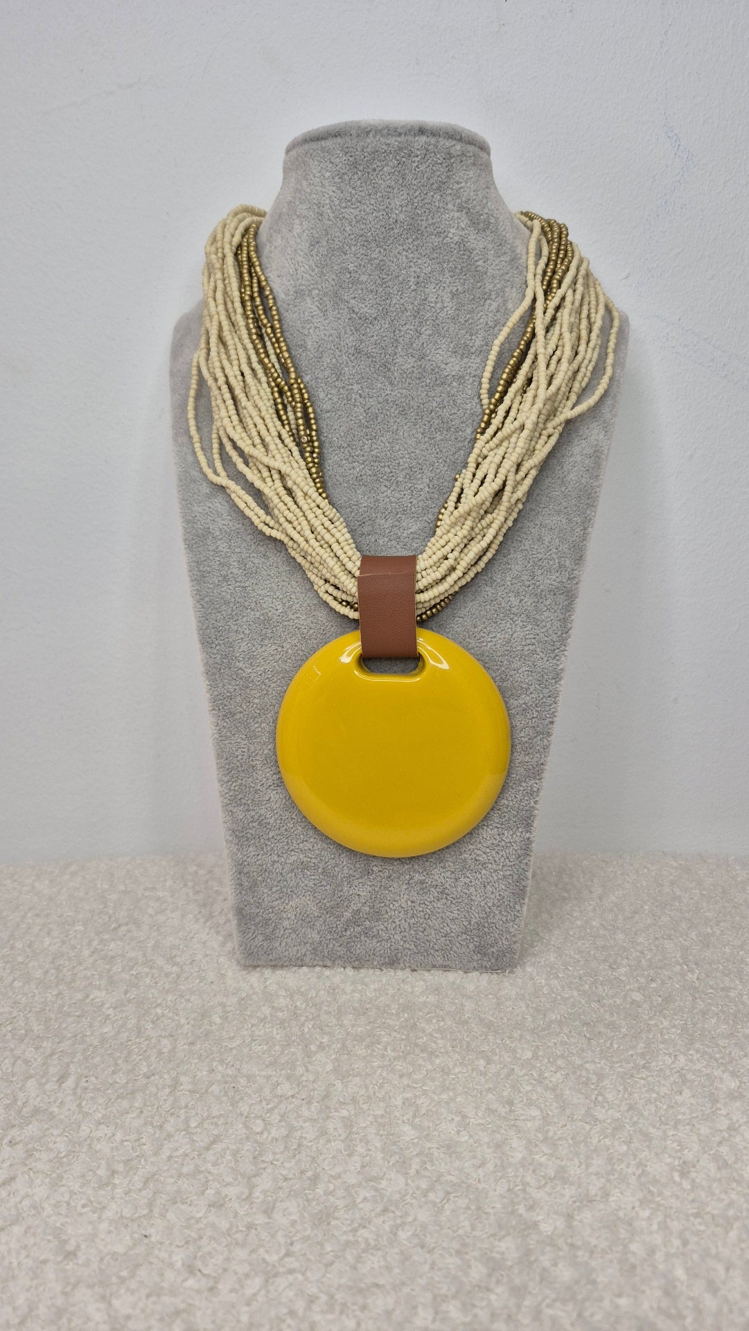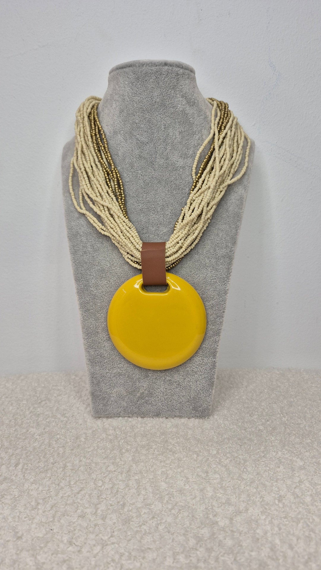 Collar corto con medallón en color mostaza. Cierre con hebilla por detrás.
