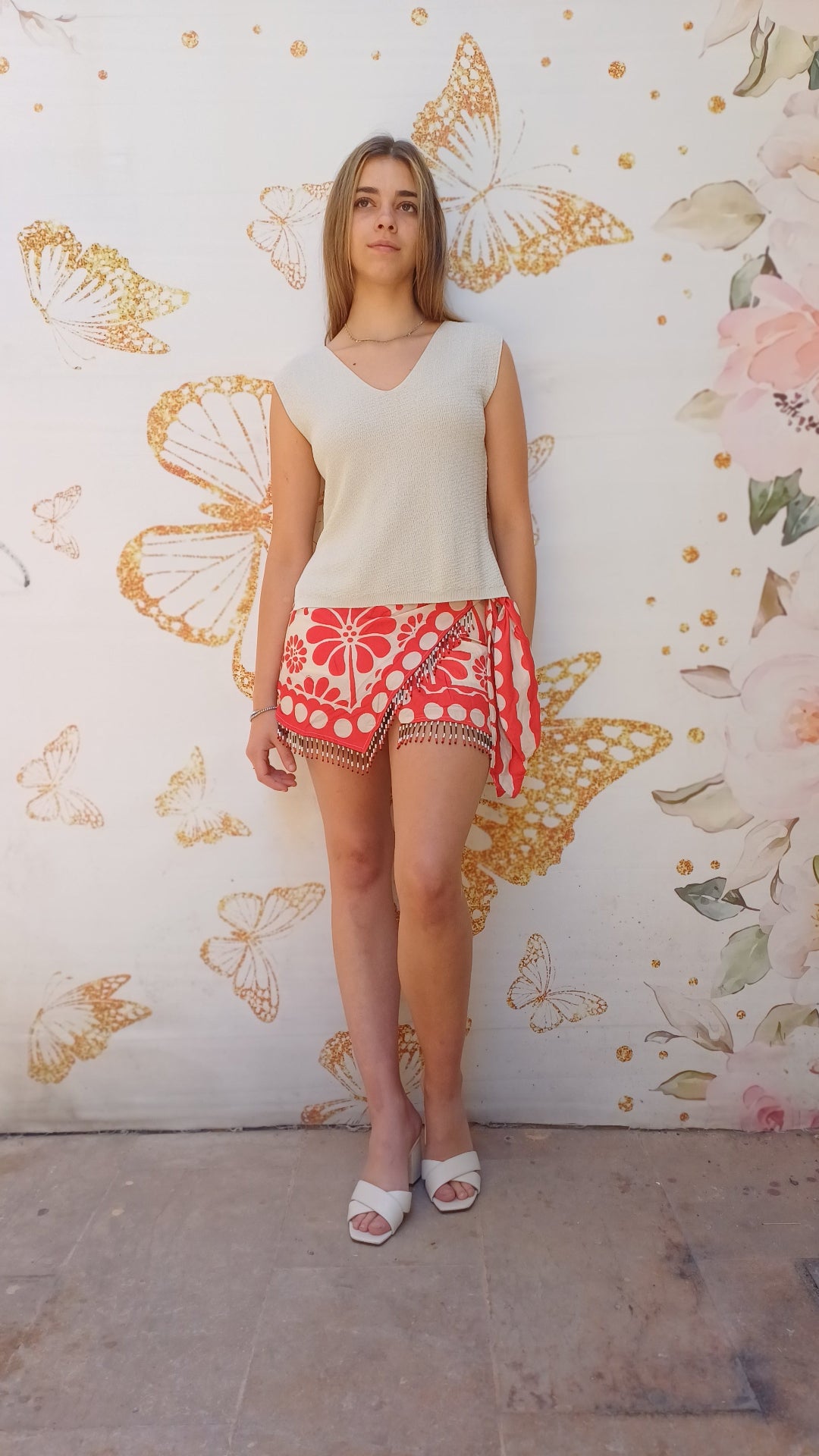 Falda pantalón corta estampada de color rojo y beige. Con flecos de pedrería.