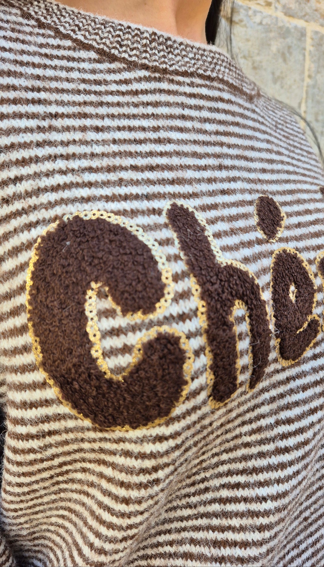 Jersey con letras de tejido de borreguito y pequeñas lentejuelas doradas.