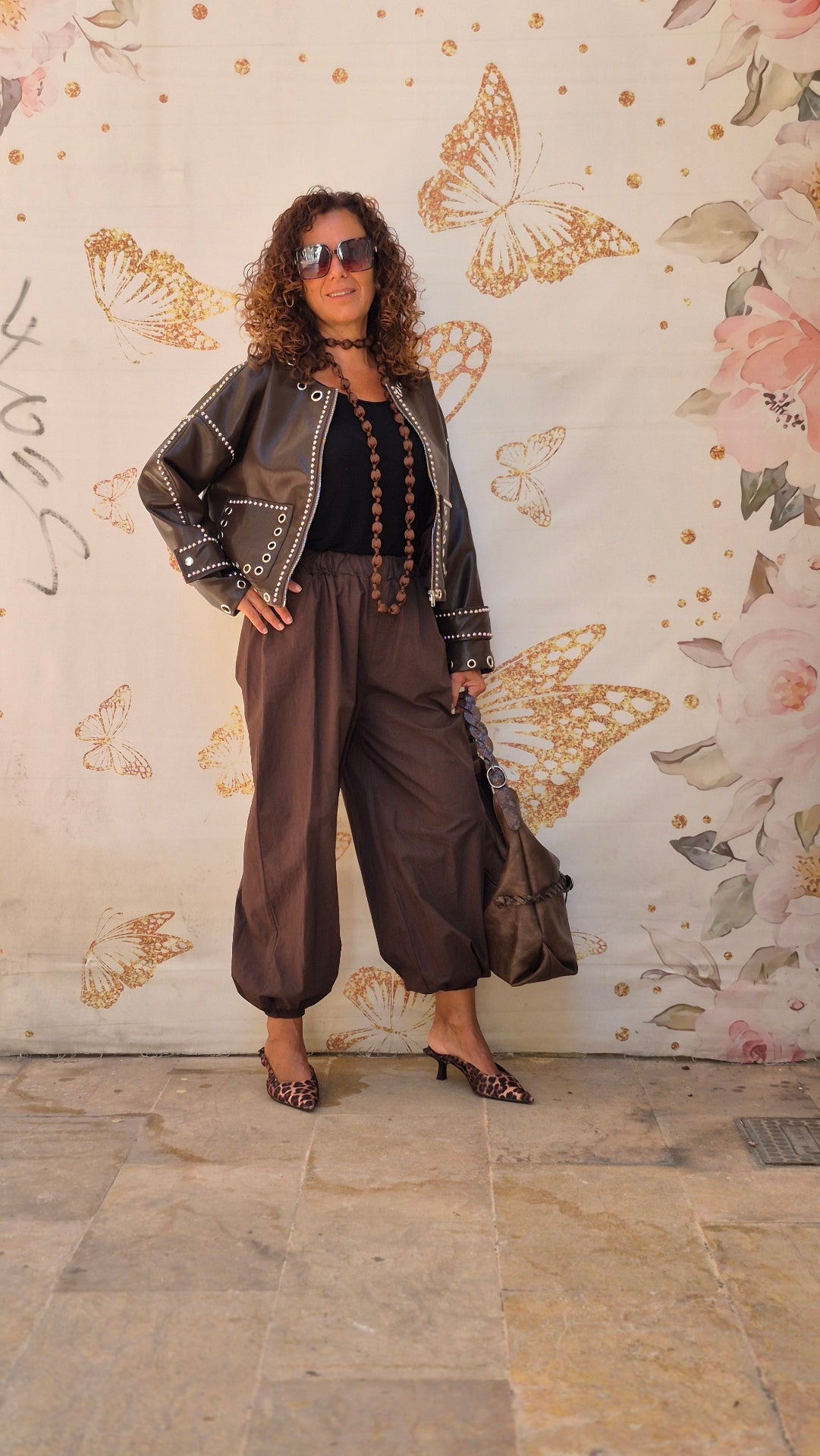 Pantalón globo (o bombacho) de mujer en color marrón chocolate. Lleva goma en la cintura y en los tobillos.
