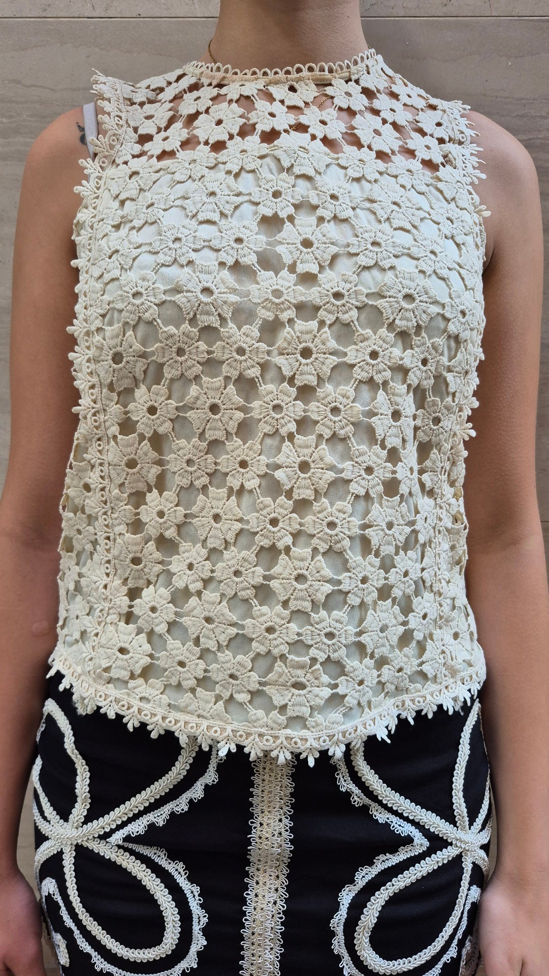 Top beige de croché con dibujos de flores. Lleva forro. Tiene botón detrás del cuello.