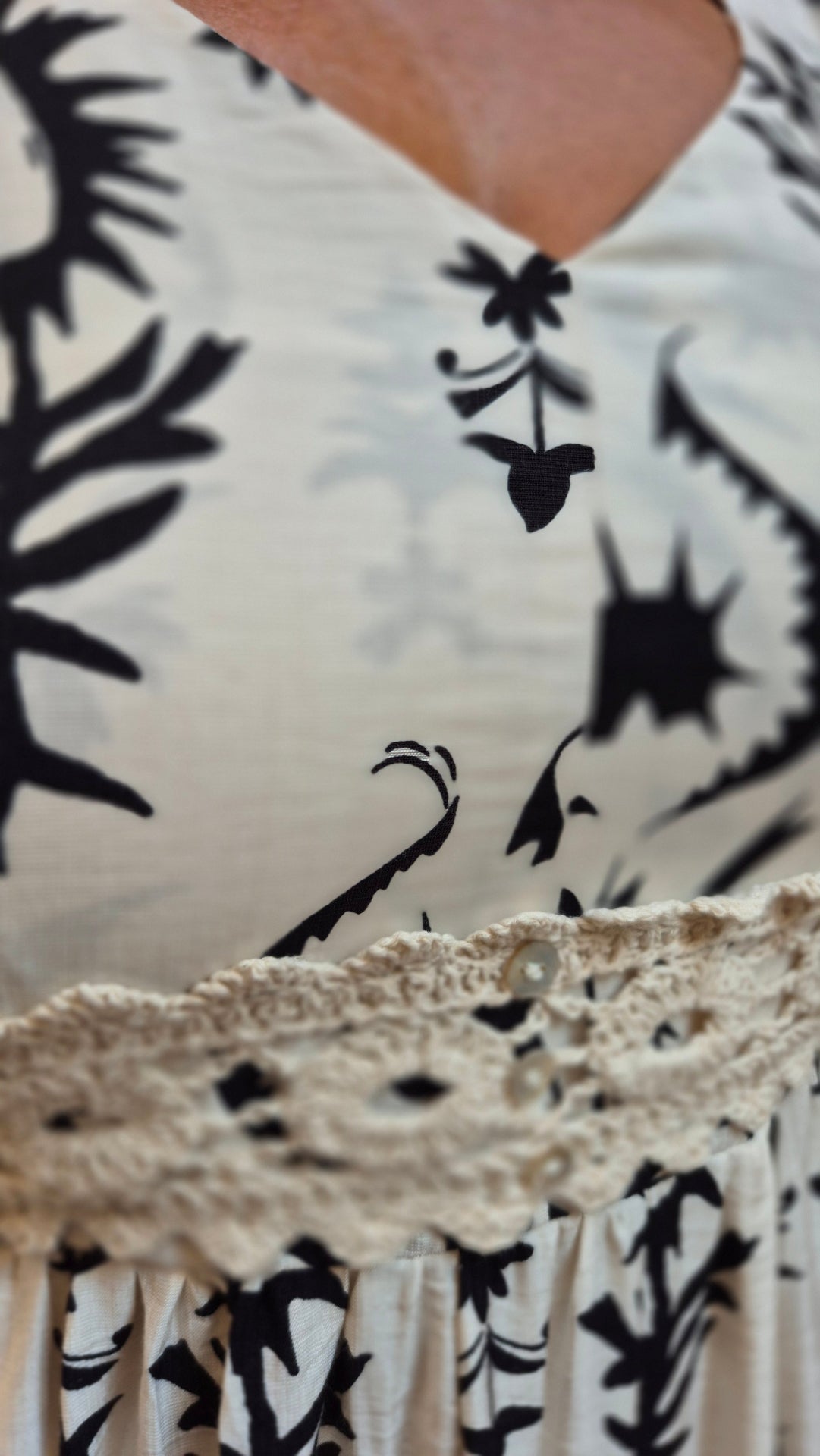 Debajo del pecho lleva un bordado de croché en color beige.