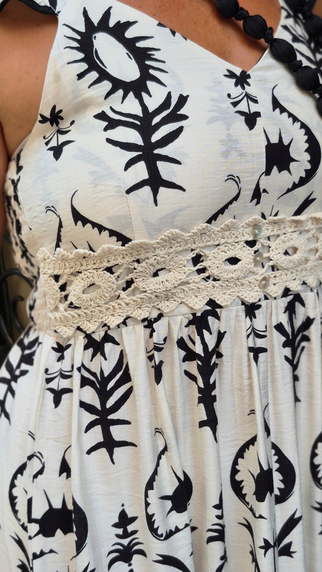 Vestido largo en blanco y con detalles en negro. De estilo bohemio