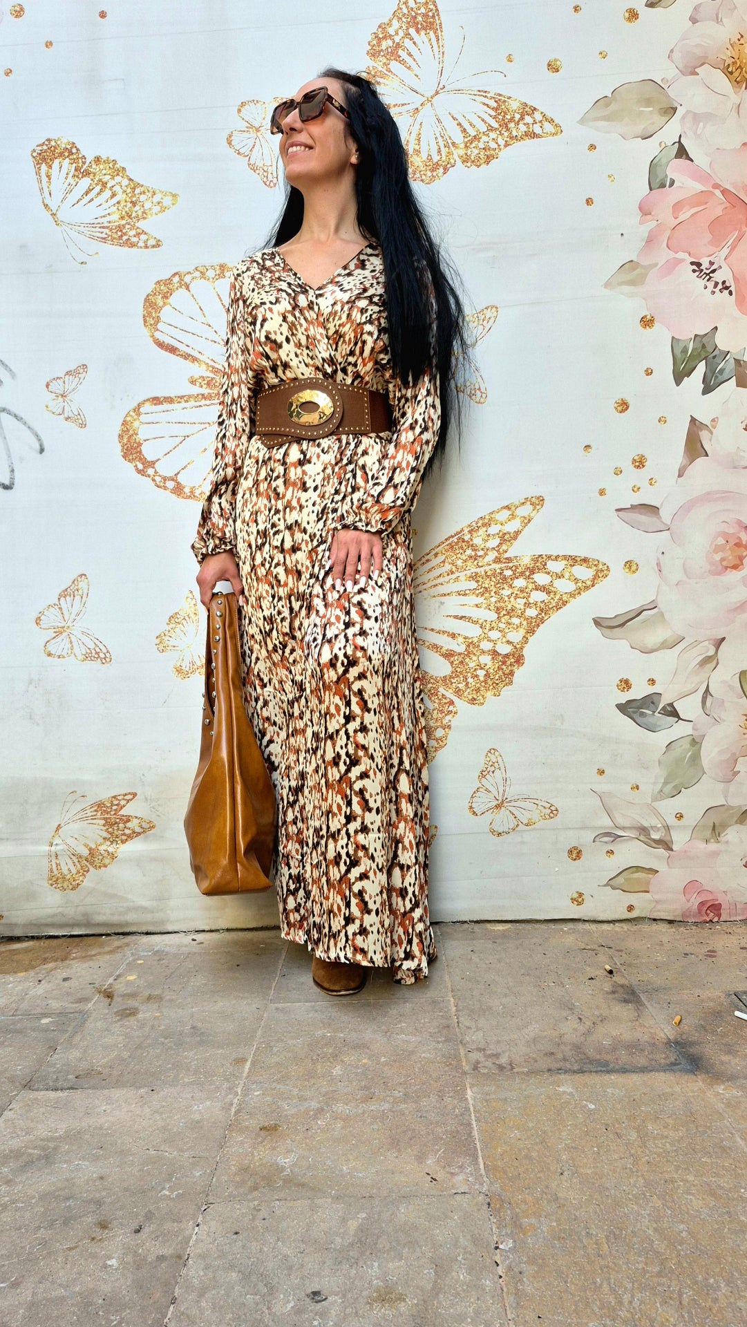 Vestido largo de mujer. Estampado en tonos marrones y beige.