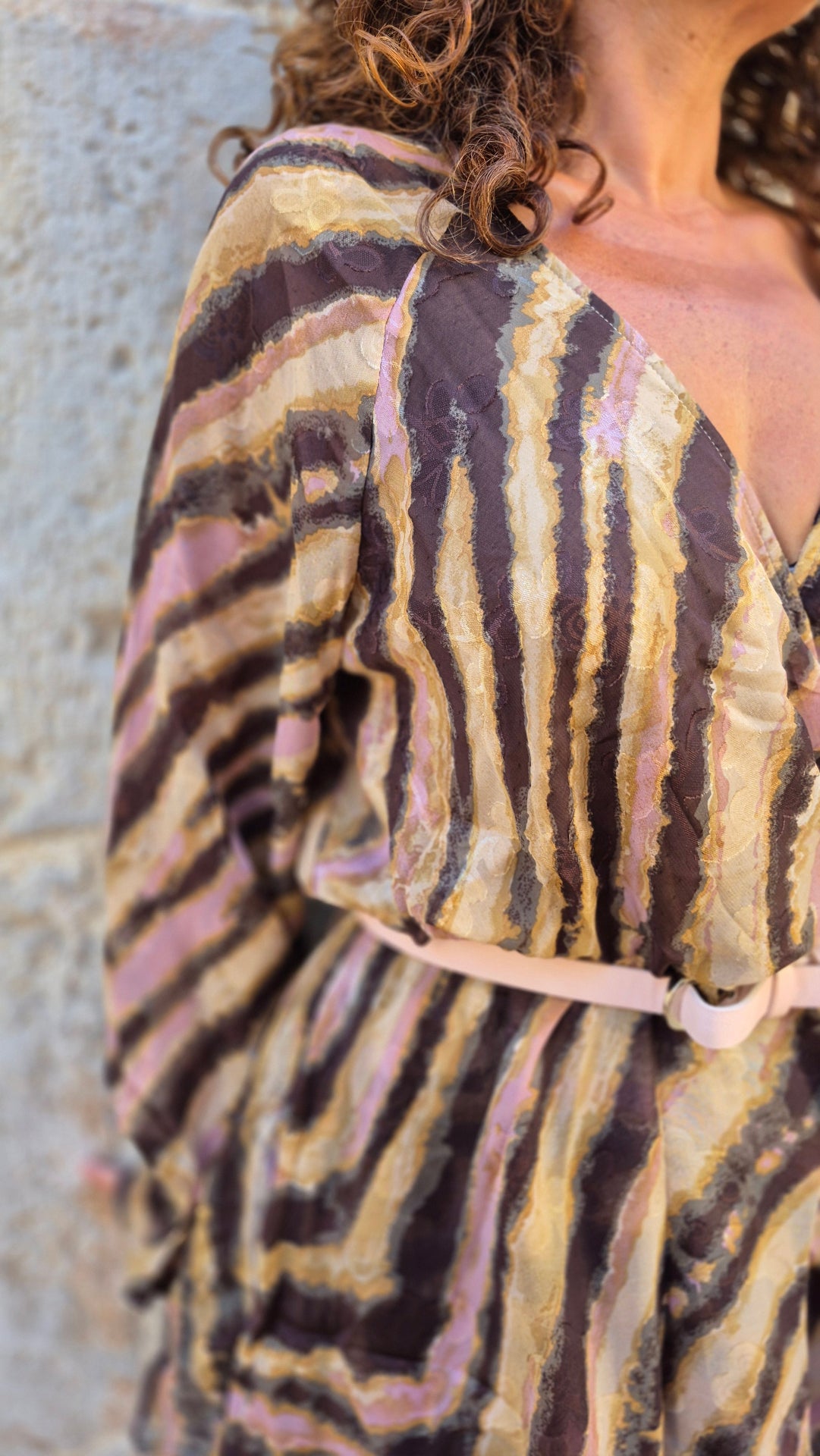 Vestido corto de mujer con estampado de cebra en diferentes colores: marrón, beige, rosa y dorado.