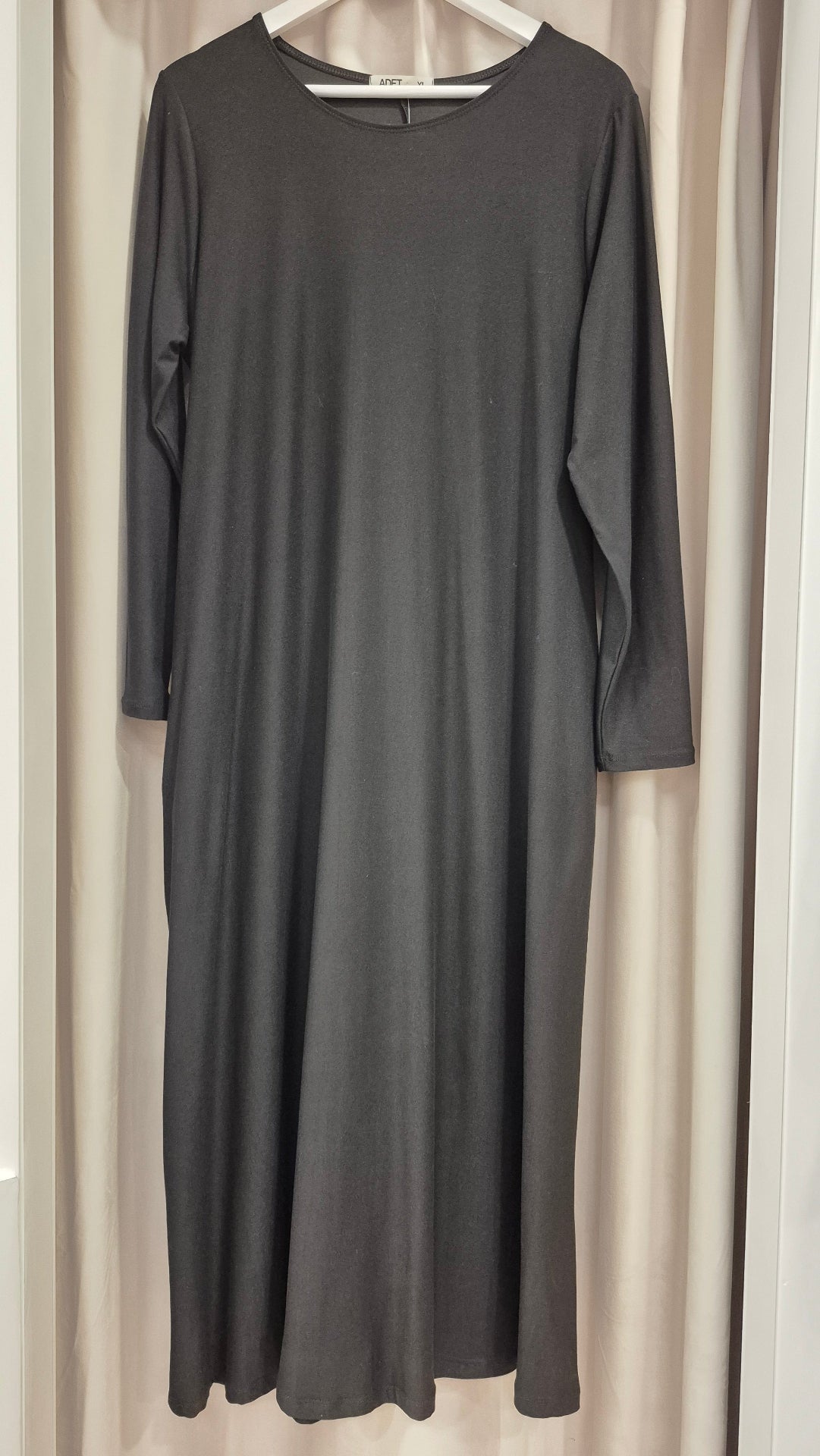 Vestido de mujer de manga larga y cuello redondo. Largo hasta los tobillos.