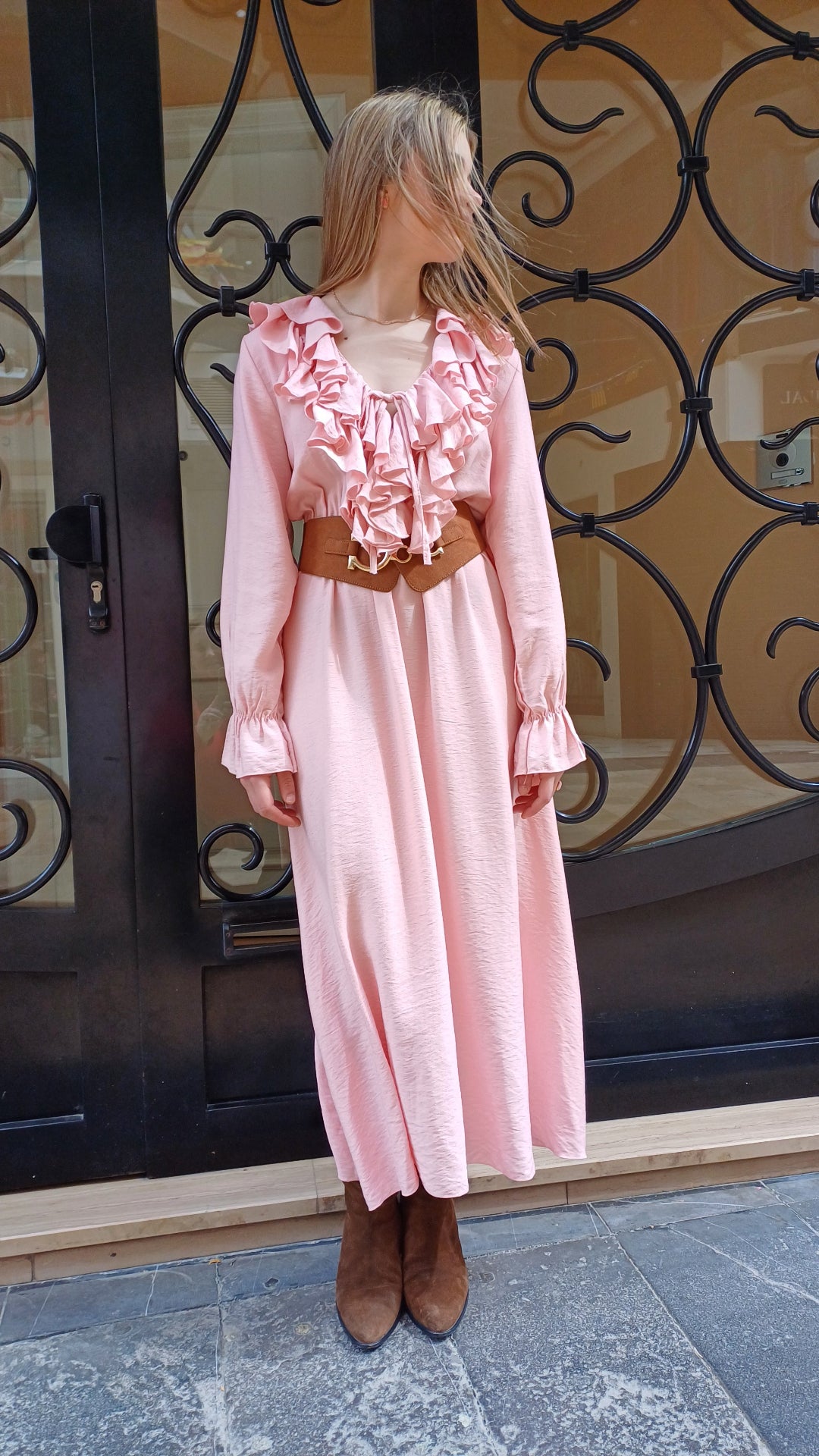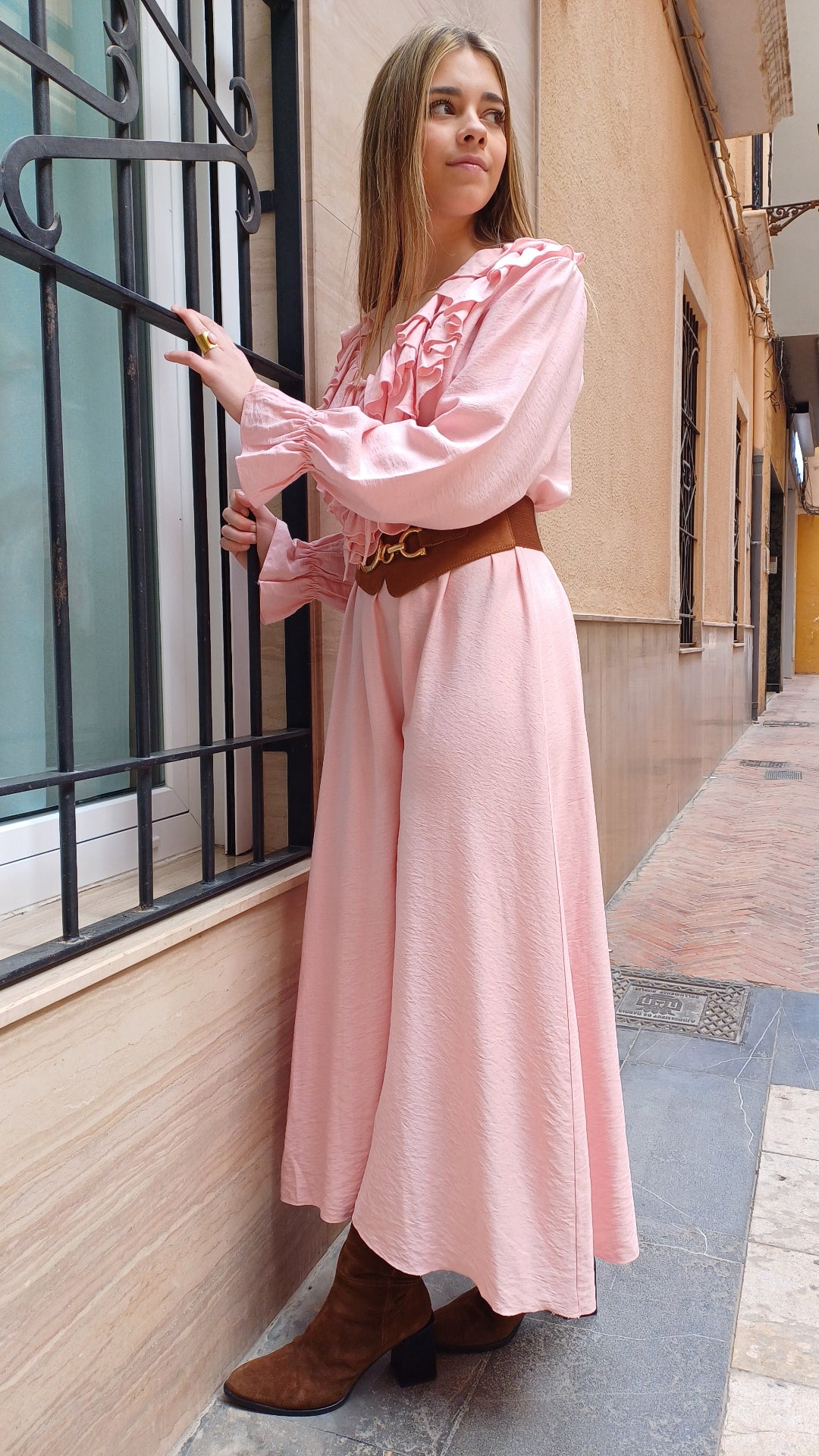 Vestido largo de estilo boho en tono rosa pastel. Manga larga acabada en volante. En el pecho lleva volantes.